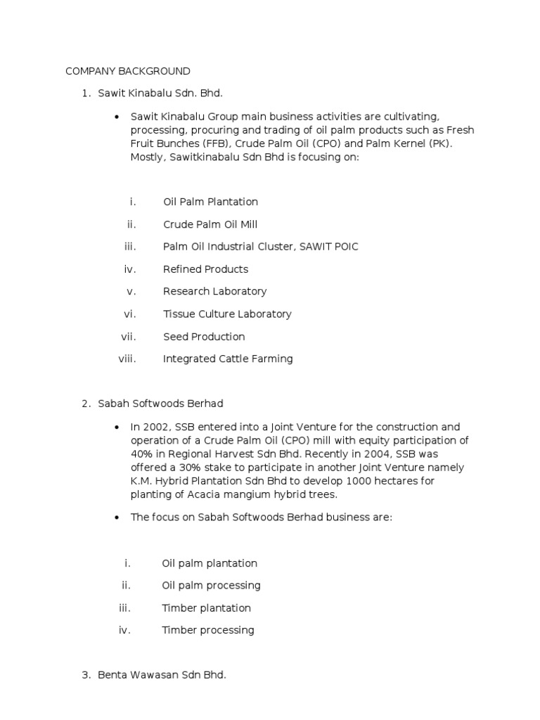 Company Background 1 Sawit Kinabalu Sdn Bhd from imgv2-2-f.scribdassets.com Sabah electricity sdn bhd contract reference:sesb t5250 year of award: Kota kinabalu, sabah 411 obserwujących. Apas balung mill (292 meeter), ipg kampus tawau (850 m), klinik kesihatan apas balung (1 km), airasia (6 km), super strap (6 km). Sawit kinabalu sdn bhd was incorporated on september 23, 1996. Off km 4 jalan tuaran, 88300 kota kinabalu, sabah, kota kinabalu, 88300, malaysia. Native borneo arts in kota kinabalu, sabah, malaysia bamboo crafts, matting from ferns, native groups: Makmuran veneer 89000 keningau, sabah, malaysia coordinate: Reisilaevadlähedal ettevõttele sawit kinabalu sdn bhd.